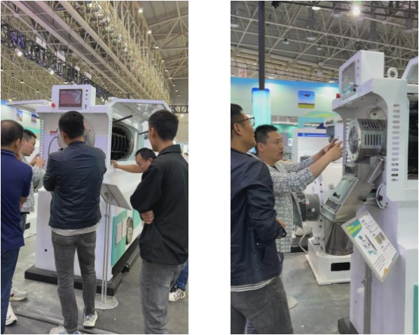 華豫萬通此次展出了HRP40智能柔性大米搓光機、YHT700智能大豆脫皮破瓣機、HTY智能葵花籽脫殼機、冰冷式纖維微粉機等創(chuàng)新產(chǎn)品亮相展會,并圍繞糧機創(chuàng)新技術(shù)和數(shù)智化工程等新質(zhì)生產(chǎn)力與看展客商探討交流,以技術(shù)實力促進(jìn)糧食加工企業(yè)轉(zhuǎn)型升級。